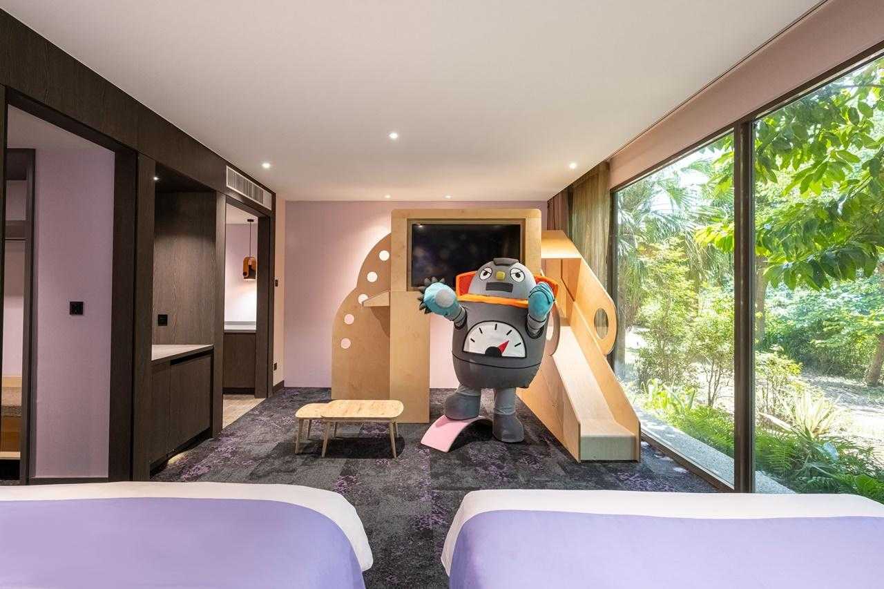 「地球尋寶主題房」整體設計以溫暖療癒的故事與色彩作勾勒,推出獨家尋寶解謎繪本遊戲、童趣玩具服務、以及搭配房型獨有的溜滑梯/攀岩牆設施,讓父母與孩子於房內尋寶的過程中,互動及探索每個角落的小秘密。